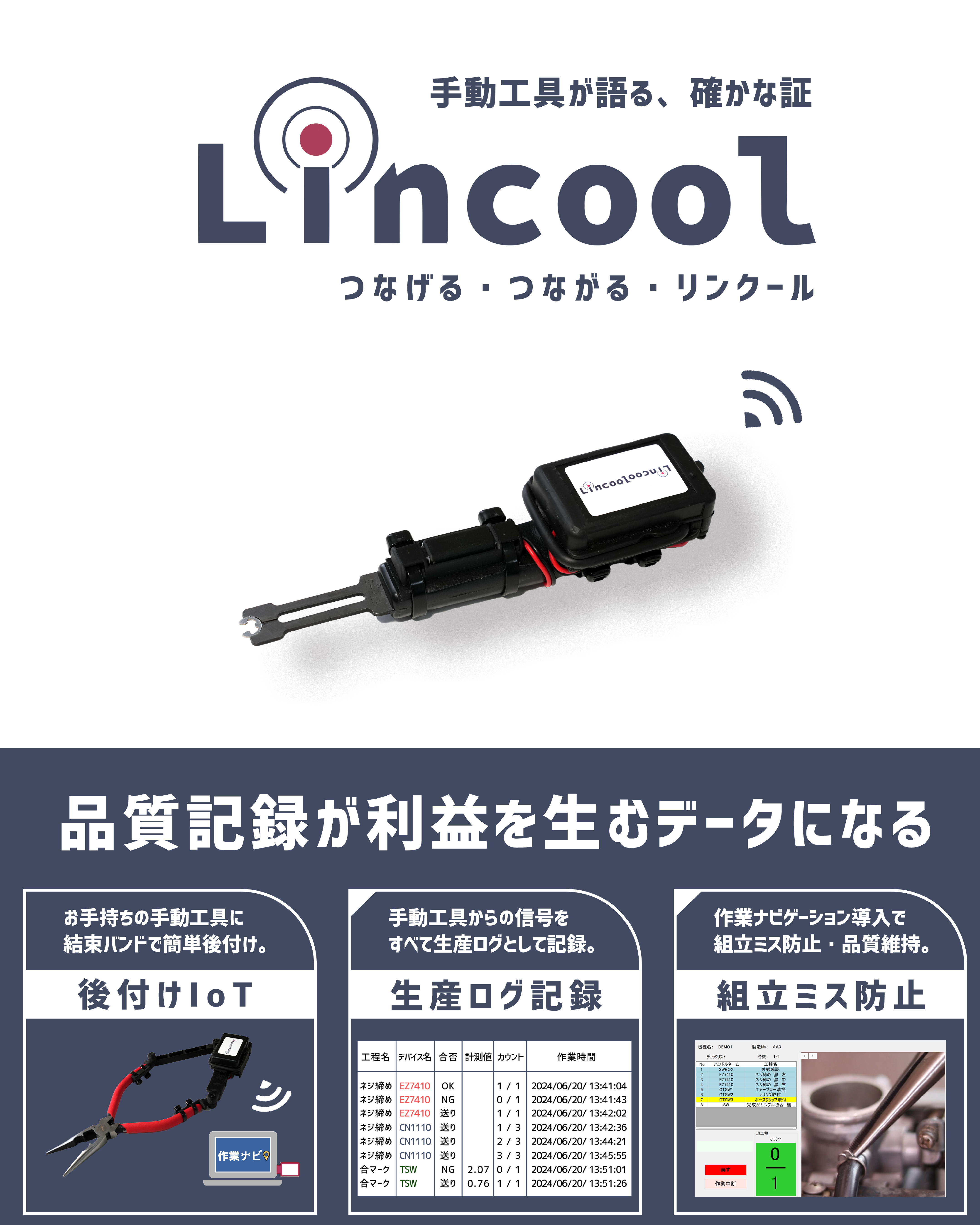 主力製品のIoTツール「Lincool(リンクール)」は、今お使いの手動工具や治具をそのままデジタル化し、