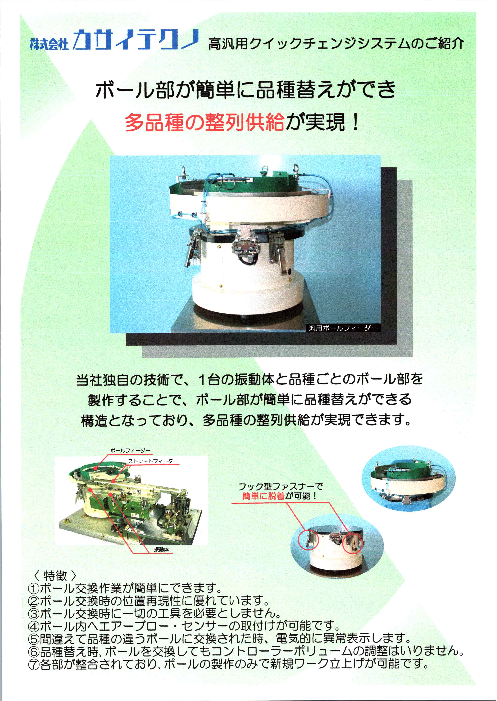 当社独自の技術で、1台の振動体と品種ごとのボール部を製作することで、ポール部が簡単に品種替えができる構造となっており、多品種の整列供給が実現できます。 ◆詳細はカタログをダウンロードしてご覧下さい。