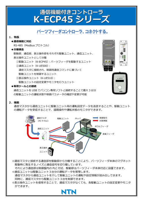 ◆特長 ・通信機能に対応 RS-485(Modbusプロトコル) ・分離構造 駆動部、通信部、表示操作部をそれぞれ駆動ユニット、通信ユニット、表示操作ユニットとして分離 ①駆動ユニット(K-ECP45):パーツフィーダを駆動するユニット ②通...