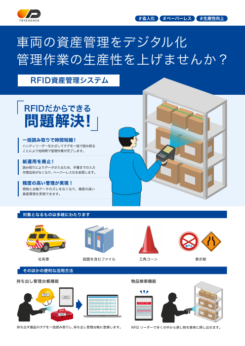 ● 一括読み取りで時間短縮! ハンディリーダーをかざしてタグを一括で読み取ることにより短時間で管理作業が完了します。 ● 紙運用を廃止! 読み取りによりデータが入るため、手書きでの入力作業自体がなくなり、ペーパーレス化を実現します。 ● ...