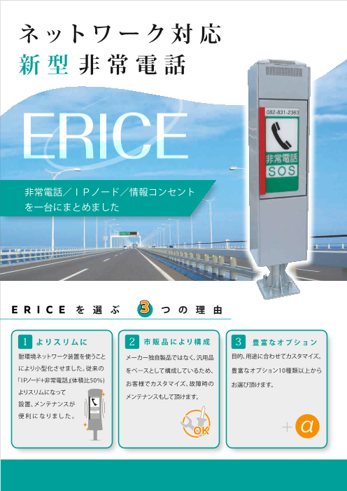 ●ERICEの特長 ・よりスリムに 屋外環境対応の小型ネットワーク装置を使うことにより小型化させました。 従来の「IPノード+非常電話」(体積比50%) よりスリムになって設置、メンテナンスが便利になりました。 ・市販品により構成...