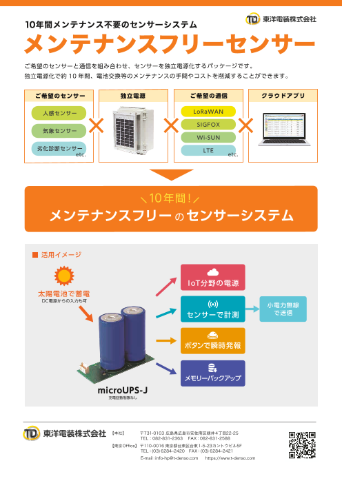ご希望のセンサーと通信を組み合わせ、センサーを独立電源化するパッケージです。 独立電源化で約10 年間、電池交換等のメンテナンスの手間やコストを削減することができます。