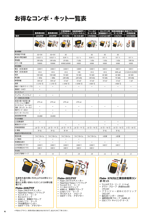 <掲載製品一例> 生産性を最大限に引き上げるお得なコンボ・キット。個々にお買い求めいただくよりお得な価格です。 【Fluke-289/FVF】 •Fluke-289マルチメーター • FlukeView® Formsソフトウェア • TL...