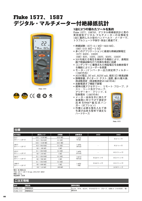 Fluke 1577、1587は、デジタル絶縁抵抗計と真の実効値型デジタル・マルチメーターの全機能を1台に集約した小型のハンドヘルド・メーターで、トラブルシュートや保守・保全に最適です。 • 絶縁試験: 1577: 0.1 MΩ~600 MΩ、15...