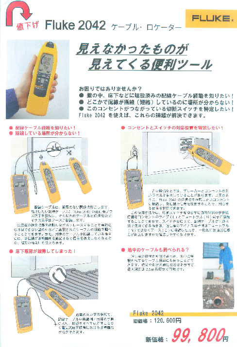 Fluke 2042は送信機と受信機からなるケーブル・ロケーターです。確認したい対象の配線ケーブルなどに送信機から信号を注入し、ケーブル周囲に生じる磁界を受信機に内蔵されたコイルで検出します。受信機の大型ディスプレイには受信感度が表示されるほか、受信機が...