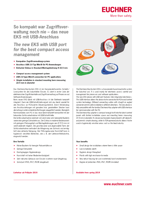USB ポート付きの新型電子キー・システム (EKS) では、電子アクセスコントロール・管理のための電子回路が完全に内蔵されています。USB インターフェースにより、PC ベースのコントロールシステムに接続できます。 電子キーアダプターは、取り付け可...