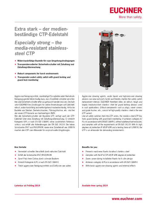 安全スイッチ CTP は、ガード・ロック付きの実証済み電子機械式安全スイッチ作動原理と、現代のトランスポンダー・コード化安全工学とを、融合させたものです。トランスポンダー技術により、単一のCTPだけで、"故障の除外"なしにEN ISO13489-41カテ...