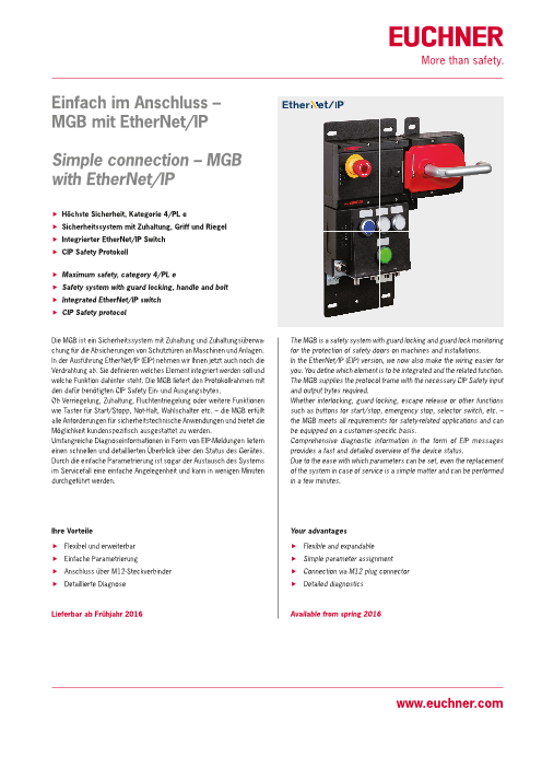 MGB は、機械や設備の安全ドアを保護するガードロックおよびガードロック モニタリング付き安全システムです。イーサネット/IP 付きバージョンでは、配線もより楽になります。お客様はどの部分を統合するか、またそれに関連する機能を指定してください。 M...