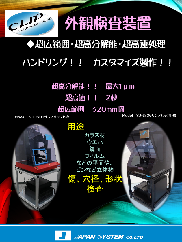 本機CLIP (クリップ)はモノクロラインカメラ(16 K画素解像度)で当社開発の高輝度マルチカラー照明を採用しカラー画像化を実現 検査用ソフトはユーザーのご要望にカスタマイズします。 ◆詳細はカタログをダウンロードしてご覧下さい。