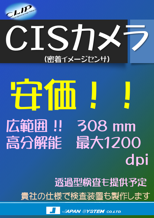 CISのカメラです。センサーと撮像エンジンの提供です。安価である事、弊社CLIPアナライザーと組み合わせて システム開発も可能です。(印刷検査CLIP COMPACTカタログも参照ください)また安価な弊社開発の 平行光を用いた透過検査装置も提供いたし...
