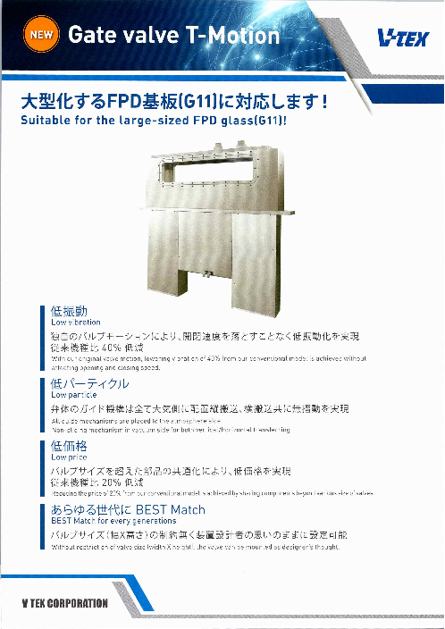・低振動 独自のバルブモーションにより、開閉速度を落とすことなく低振動化を実現 従来機種比40%低減 ・低パーティクル 弁体のガイド機構は全て大気側に配置縦搬送、横搬送共に無摺動を実現 ・低価格 バルブサイズを超えた部品の共通化により...
