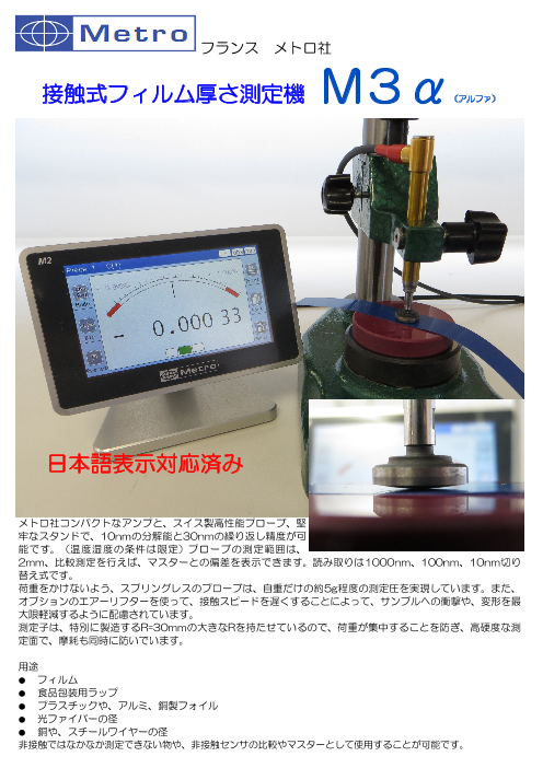 プローブの測定範囲は、2mm、比較測定を行えば、マスターとの偏差を表示できます。読み取りは1000nm、100nm、10nm切り替え式です。荷重をかけないよう、スプリングレスのプローブは、自重だけの約5g程度の測定圧を実現しています。また、オプションのエ...