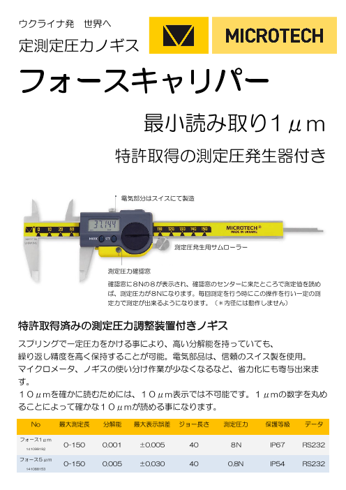スプリングで一定圧力をかける事により、高い分解能を持っていても、繰り返し精度を高く保持することが可能。電気部品は、信頼のスイス製を使用。マイクロメータ、ノギスの使い分け作業が少なくなるなど、省力化にも寄与出来ます。10μmを確かに読むためには、10μm表...