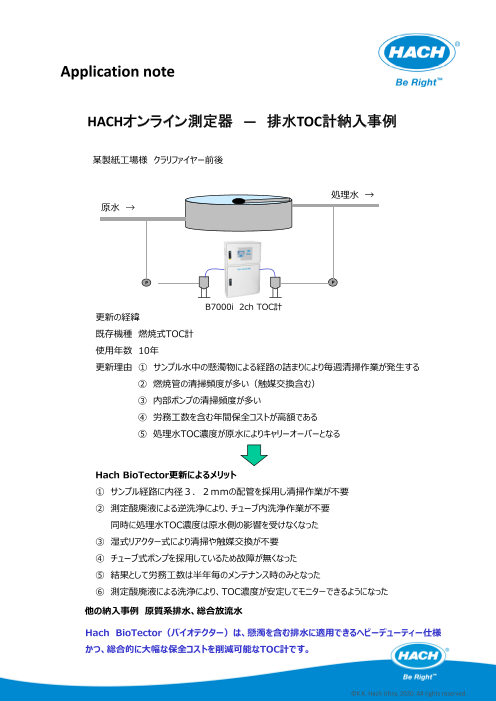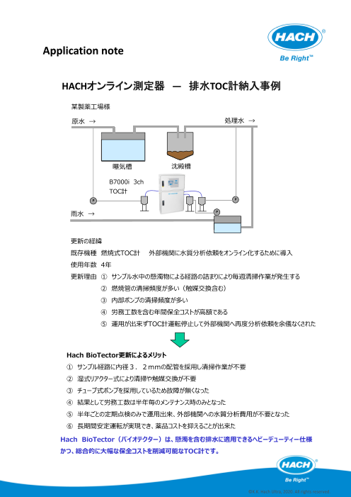 【Hach BioTector更新によるメリット】 ・サンプル経路に内径3.2mmの配管を採用し清掃作業が不要 ・測定酸廃液による逆洗浄により、チューブ内洗浄作業が不要 同時に処理水TOC濃度は原水側の影響を受けなくなった ・湿式リアク...