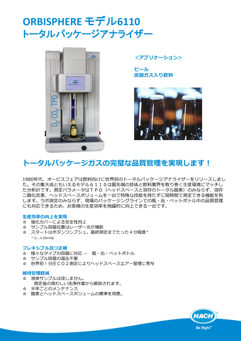 1980年代、オービスフェアは飲料向けに世界初のトータルパッケージアナライザーをリリースしまし た。その集大成ともいえるモデル6110は最先端の技術と飲料業界を取り巻く生産環境にマッチし た分析計です。測定パラメータはTPO(ヘッドスペ...