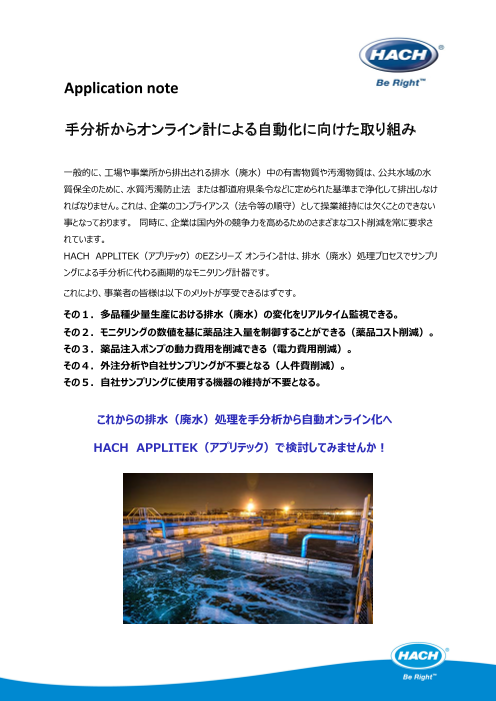 これからの排水(廃水)処理を手分析から自動オンライン化へHACHAPPLITEK(アプリテック)で検討してみませんか! 一般的に、工場や事業所から排出される排水(廃水)中の有害物質や汚濁物質は、公共水域の水質保全のために、水質汚濁防止法または都...