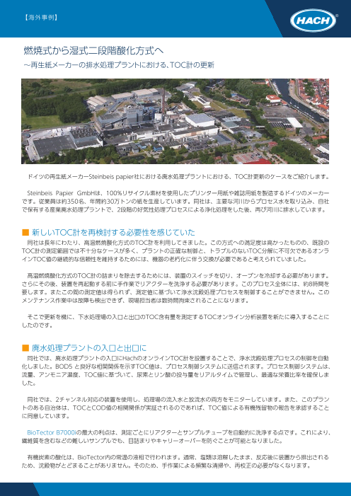 ドイツの再生紙メーカーSteinbeis papier社における廃水処理プラントにおける、TOC計更新のケースをご紹介します。 この企業では、既設の燃焼酸化方式に対する満足度は高かったものの、TOC計の測定範囲では不十分なケースが多く、プラントの正...