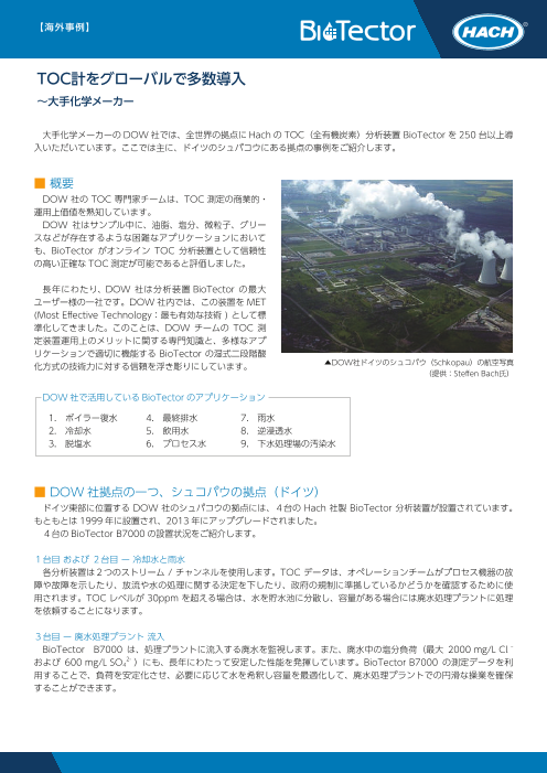 大手化学メーカーのDOW社では、全世界の拠点にHachのTOC(全有機炭素)分析装置BioTectorを250台以上導入いただいています。ここでは主に、ドイツのシュパコウにある拠点の事例をご紹介します。