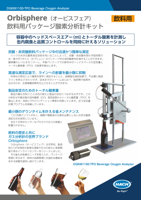 ◆炭酸・非炭酸飲料パッケージ中の迅速かつ簡単な測定 HACHの光学式酸素測定技術を用いることによって、炭酸・非炭酸を問わず短時間でPETや瓶・缶のパッケージ中の溶存酸素を計測することが出来ます。この分析計は酸素量のレベルをモニターし、平...