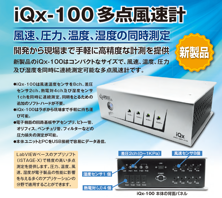 コンパクトサイズで、風速・圧力・温度・湿度の連続同時測定が可能な多点風速計をご紹介。