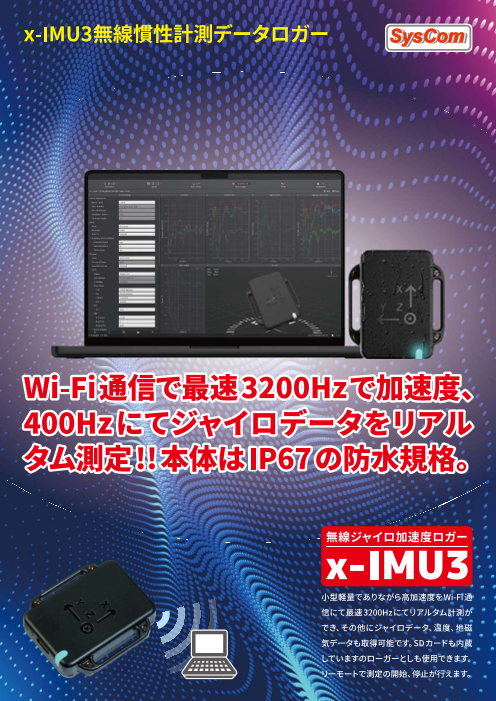 傾きジャイロセンサだけでなく、新たに、±24Gと±200Gの加速度センサが搭載された、小型充電式無線ユニットです。 手のひらサイズのこれ1台だけで、測定したかった項目を網羅しているため、アプリケーション事例がさらに広がりました。 3Dグラフ画像はリア...