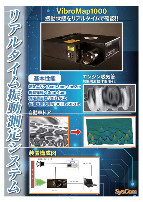 VibroMapはESPI(エレクトロニクス・スペックル干渉測定法)を利用した、全く新しい振動・変位解析装置。 測定結果の画像データがリアルタイムで表示され、振動周波数のスウィープ、静的変形など負荷調整を画面を見ながら行うことができます。 非常に短時...