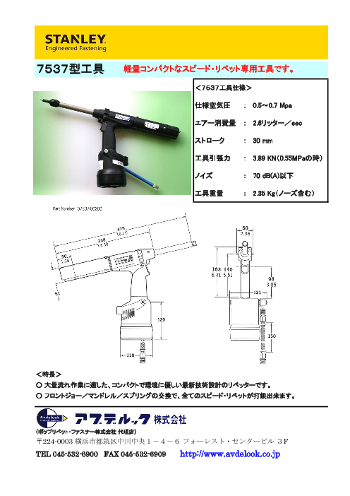 仕様空気圧 : 0.5~0.7 Mpa エアー消費量: 2.6リッター/sec ストローク: 30 mm 工具引張力: 3.89 KN(0.55MPaの時) ノイズ: 70 dB(A)以下 工具重量: 2.35 Kg(ノーズ含む) ◆...