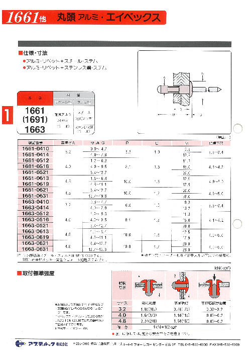 ◆仕様・寸法 アルミ・リベット+スチール・ステム アルミ・リベット+ステンレス鋼・ステム ◆詳細はカタログをダウンロードしてご覧下さい。