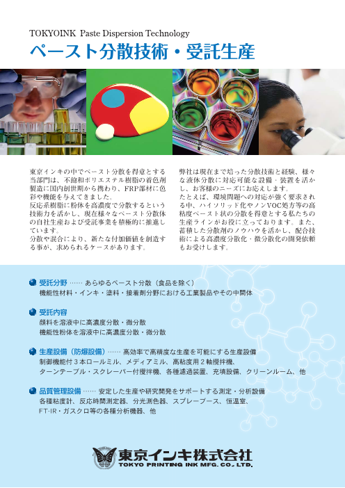 ①環調調和型グラビアインキ(ライスインキ) 非食用部分の国産米の米ぬかを利用した循環型社会の形成に貢献するグラビアインキ ②高遮光インキ 重ね刷りなしでも遮光性を実現し印刷により光線から内容物を守るグラビアインキ ③高機能マットインキ ...