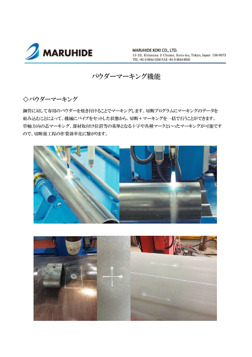 丸秀製のパイプ自動切断機:パイプコースターのオプション機能、パウダーマーキングについてご紹介いたします。 パウダーマーキングとは、専用のパウダーを鋼管に焼き付けてマークする方法を言います。 YouTubeでは動画もご覧いただけます、ぜひご覧ください。