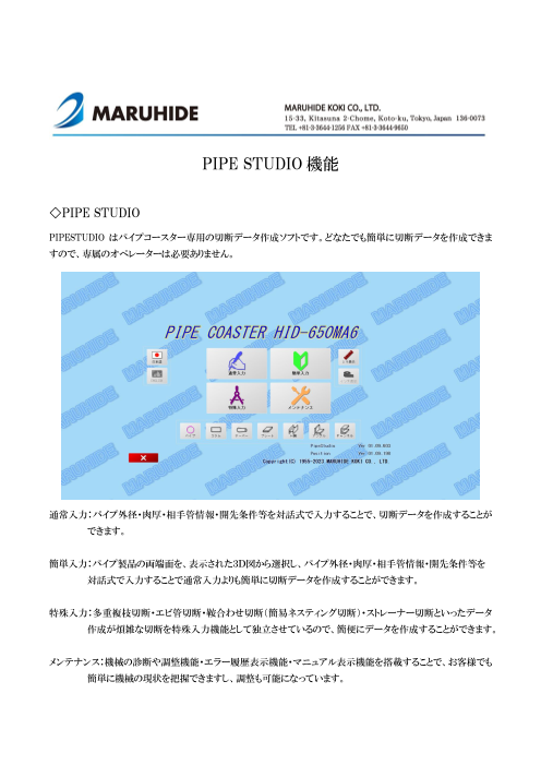 丸秀製のパイプ自動切断機:パイプコースターのソフトウェア、PIPE STUDIOについてご紹介いたします。 多数の切断テンプレートによって、専門知識がなくても即座にデータの作成ができる仕様になっております。加工図は3Dで表示され、あらゆる角度から自由に...