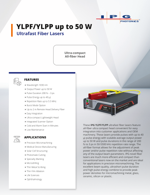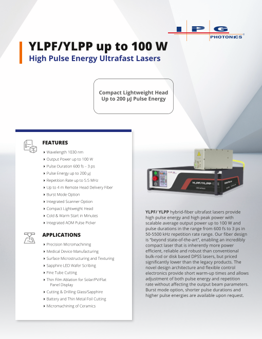 優れたビーム品質、超短パルス持続時間、高パルスエネルギーなどの特性によって、金属、ガラス、セラミック、 シリコン、プラスチックなど、ほぼあらゆる材料の微細加工に適したピークパワー密度が実現します。また、超 短パルス持続時間とグリーン波長により、熱影響...