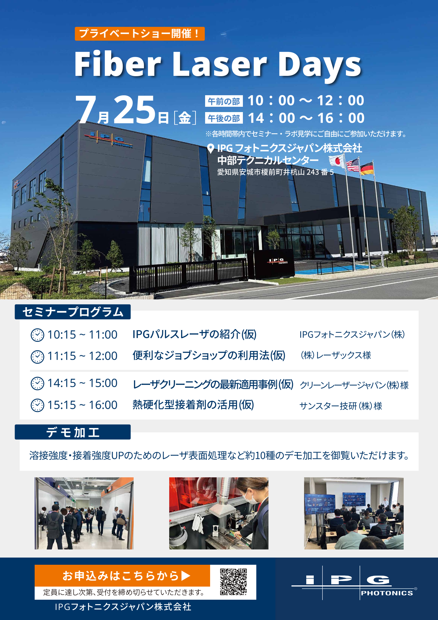 プライベートショーを開催します! ◆Fiber Laser Days 日程:7月25日(金) 会場:弊社中部テクニカルセンター(愛知県安城市) 申し込み:https://forms.office.com/r/iw4z28nGmn 年内...
