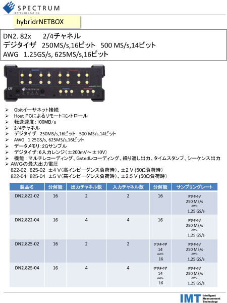 一つのBOXの中に任意波形発生器(AWG)とデジタイザを組み込んだhybridNETBOX。 信号発生とデータの読み取りが同期して行え、対象に信号を与え、その反応出力を測定する用途に最適な測定器。 LAN経由でLANシステム或いはPCに接続して、ホス...