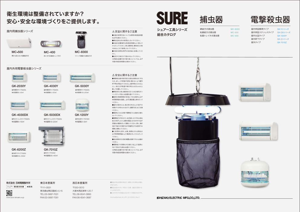 掲載製品 ◆捕虫器 ・網袋方式捕虫器 ・粘着紙方式捕虫器 ・粘着トレイ方式捕虫器 ◆電撃殺虫器 ・屋内角型標準タイプ ・屋内角型ステンレスタイプ ・屋内丸型タイプ ・屋外軒下タイプ ・屋外タイプ ◆詳細はカタログをダウンロードし...