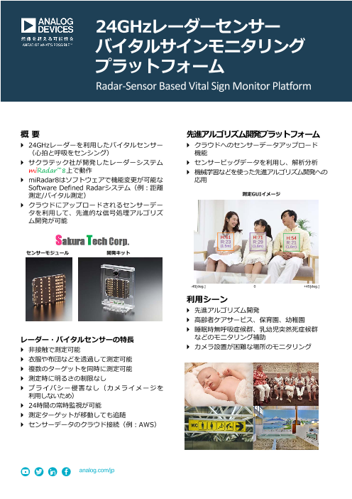 ◆サクラテック社が開発したレーダーシステムmiRadar(TM)8上で動作 ◆miRadar8はソフトウェアで機能変更が可能なSoftware Defined Radarシステム(例:距離測定/バイタル測定) ◆クラウドにアップロードされるセンサーデ...