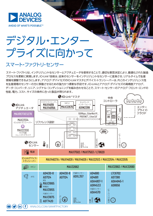 IO-Link®技術は、従来のセンサーをインテリジェントなセンサーに変身させ、リアルタイムで生産現場を調整できるようにします。アナログ・デバイセズのIO-Linkマスタとデバイス・トランシーバーは、PLCのインテリジェンス性を生産現場のセンサーの方に移動...