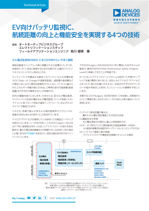 バッテリ・パックを構成する数多くのバッテリ・セルの充電状態(SOC:State of Charge)や温度を監視し、過放電や過充電などが発生しないように適切な制御を行うとともに、バッテリに蓄えられたエネルギーを最大限に引き出して車両の走行可能距離(航続距...