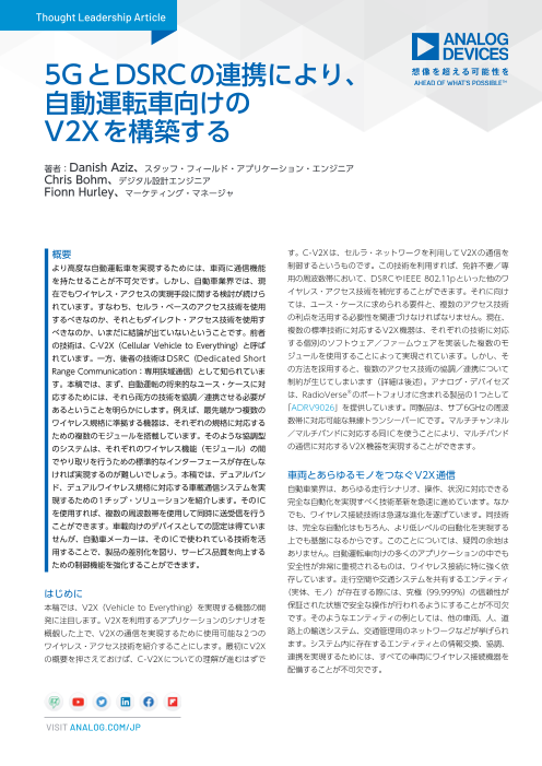 本稿では、まず、自動運転の将来的なユース・ケースに対応するためには、両方の技術を協調/連携させる必要があるということを明らかにします。例えば、最先端かつ複数のワイヤレス規格に準拠する機器は、それぞれの規格に対応するための複数のモジュールを搭載しています。...