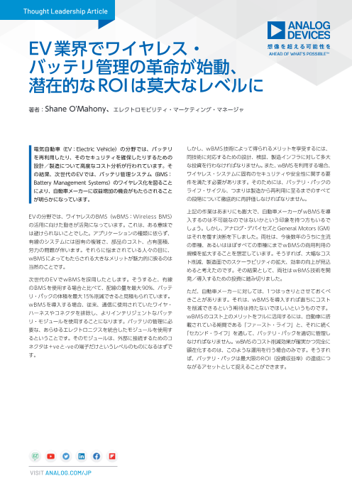 EVの分野では、ワイヤレスのBMS(wBMS:Wireless BMS)の活用に向けた動きが活発になっています。これは、ある意味では避けられないことでした。アプリケーションの種類に依らず、有線のシステムには固有の複雑さ、部品のコスト、占有面積、労力の問題...