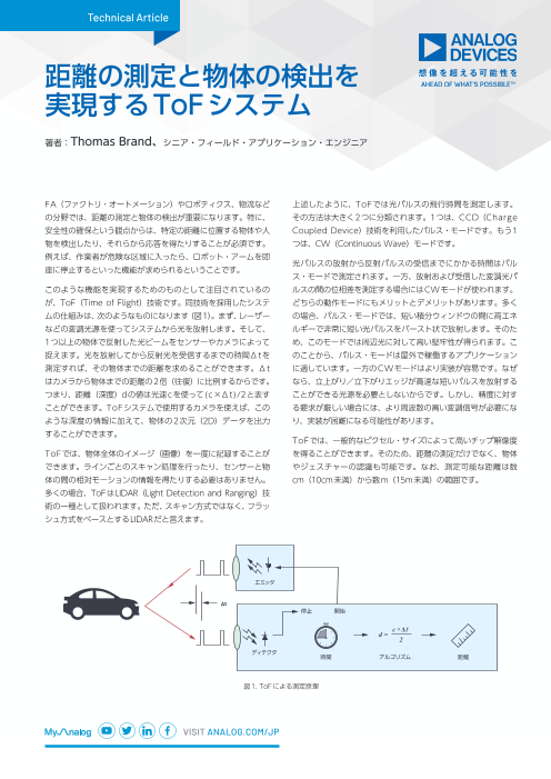 安全性の確保を実現するためのものとして注目されているのが、ToF(Time of Flight)技術です。同技術を採用したシステムの仕組みは、まず、レーザーなどの変調光源を使ってシステムから光を放射します。そして、1つ以上の物体で反射した光ビームをセンサ...