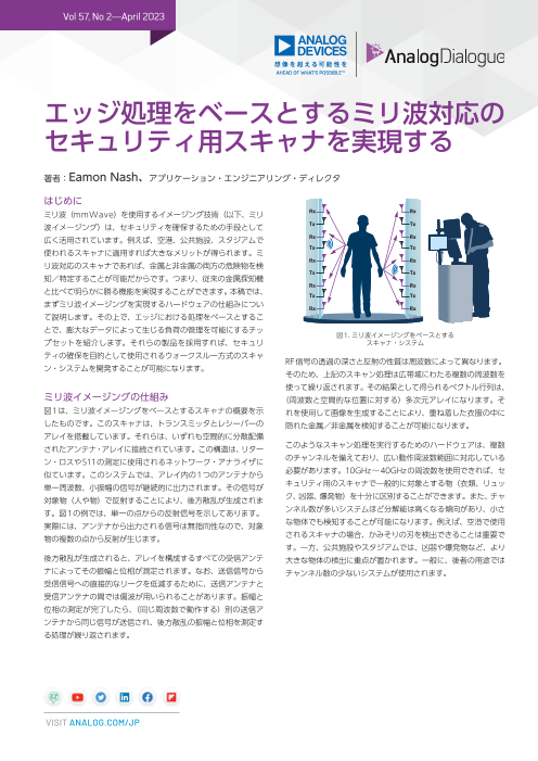 ミリ波対応のスキャナであれば、金属と非金属の両方の危険物を検知/特定することが可能です。つまり、従来の金属探知機と比べて明らかに勝る機能を実現することができます。本稿では、まずミリ波イメージングを実現するハードウェアの仕組みについて説明します。その上で、...