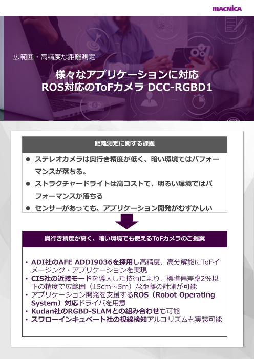 奥行き精度が高く、暗い環境でも使えるToFカメラ。 ・アナログ・デバイセズのアナログ・フロントエンドを採用し、高精度、高分解能にToFイメージング・アプリケーションを実現。 ・CIS社の近接モードを導入した技術により、標準偏差率2%以下の精度で広範囲...
