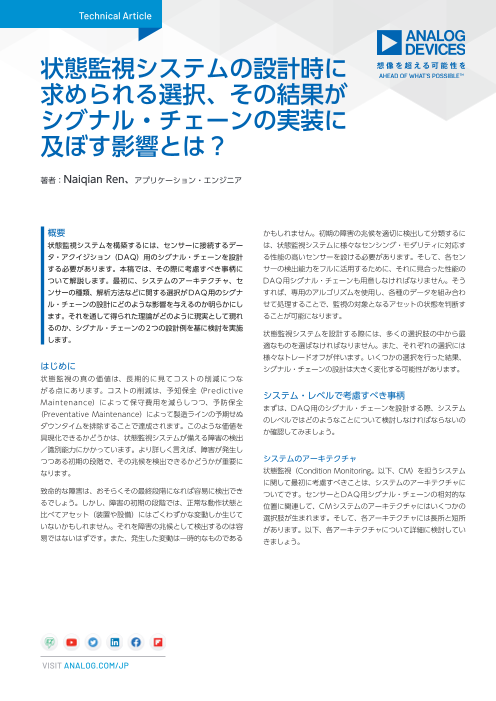 最初に、システムのアーキテクチャ、センサーの種類、解析方法などに関する選択がDAQ用のシグナル・チェーンの設計にどのような影響を与えるのか明らかにします。それを通して得られた理論がどのように現実として現れるのか、シグナル・チェーンの2つの設計例を基に検討...