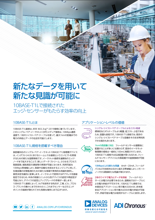 10BASE-T1Lとは 10BASE-T1L接続は、IEEE 802.3cgTM-2019規格に基づいています。このシングル・ペア・イーサネット(SPE)メディア規格は、10Mbps通信速度で、1対のツイスト・ペア・ケーブルを使って、最大1kmの距離...