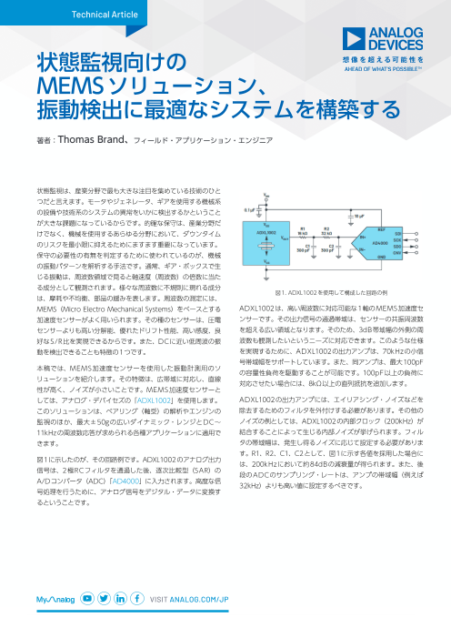 状態監視は、産業分野で最も大きな注目を集めている技術のひとつだと言えます。モータやジェネレータ、ギアを使用する機械系の設備や技術系のシステムの異常をいかに検出するかということが大きな課題になっているからです。的確な保守は、産業分野だけでなく、機械を使用す...