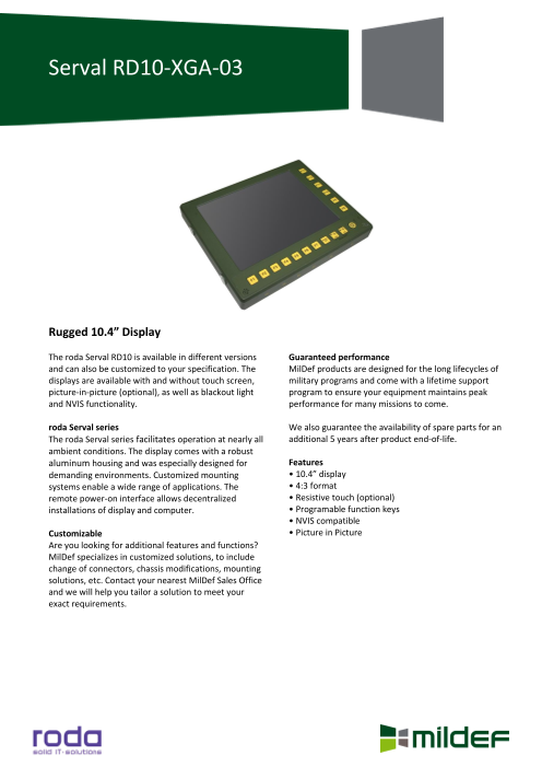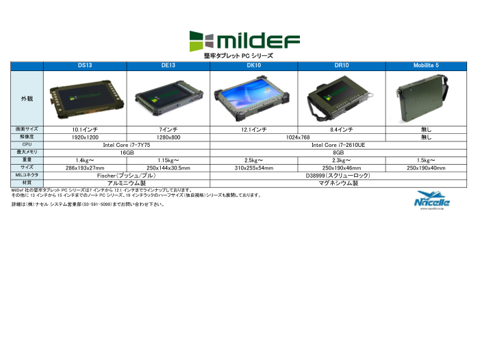 MilDef 社の堅牢タブレット PC シリーズは7 インチから 12.1 インチまでラインナップしております。 その他に 13 インチから 15 インチまでのノート PC シリーズ、19 インチラックのハーフサイズ(独自規格)シリーズも展開しておりま...