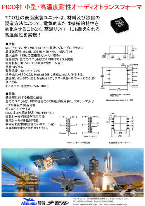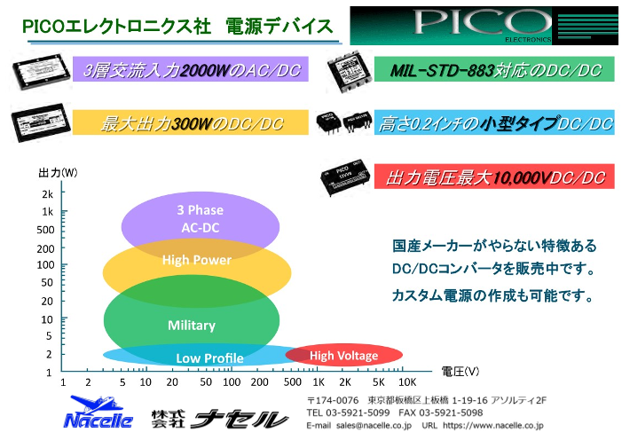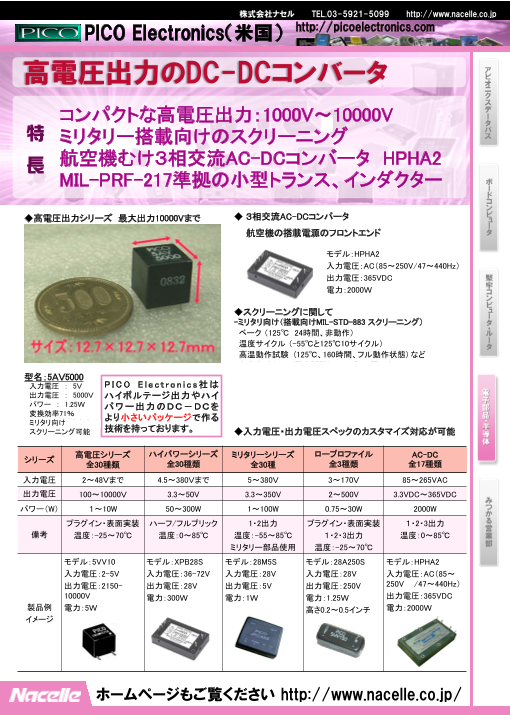 ■PICO社 電源デバイスの特徴 ・コンパクトかつ高電圧出力:1000V~10000V ・ミリタリ搭載向けのスクリーニング ・航空機向け3相交流AC-DCコンバータ HPHA2 ・MIL-PRF-27準拠の小型トランス/インダクタ...