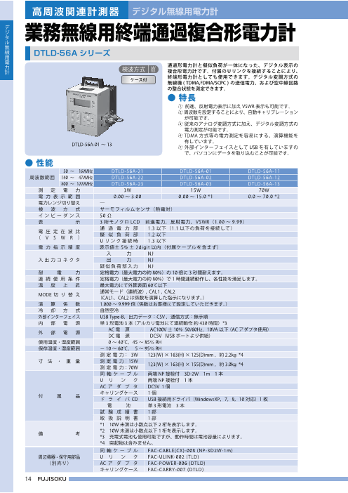●特長 ① 電力の検出は熱電変換方式を採用し、波形歪の誤差 がなく、広帯域を高い精度で測定できます。 ② 小形、軽量のため携帯に便利ですので、生産ライン での調整や移動無線機の保守サービス等に最適です。 ③ モニタ出力を設けておりますので、周波...