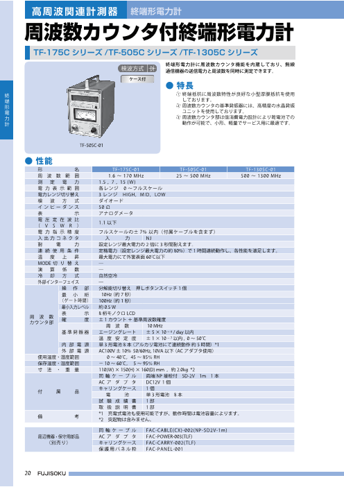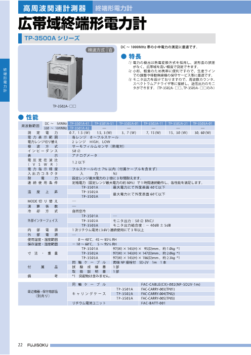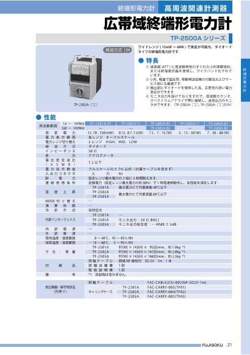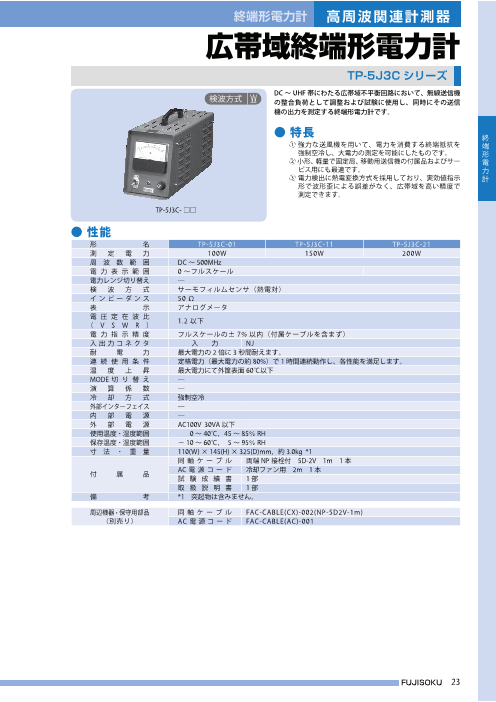 ●特長 ① 電力検出に熱電変換方式を採用し、出力波形歪による 誤差がなく、FM 変調の送信出力を非常に高精度で 測定できます。 ② AM 変調の小中電力測定にもお使いいただけます。